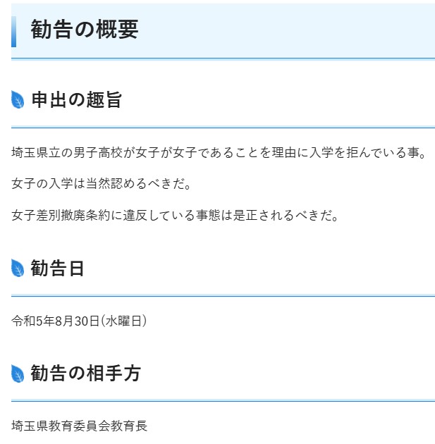詳しくは、埼玉県男女共同参画苦情処理委員による勧告についてのページをご覧ください。https://www.pref.saitama.lg.jp/a0309/news/page/20230831.html?utm_source=chatgpt.com