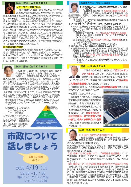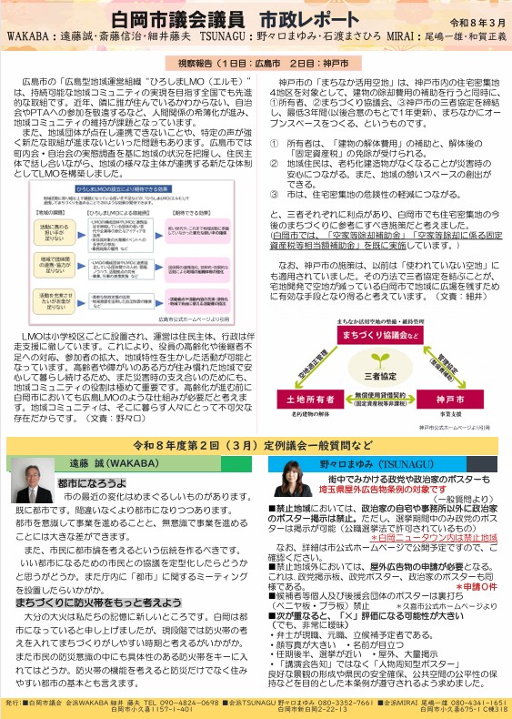 さて、本日の朝刊に連合会派レポートを折込みました。無所属議員の3つの会派。7名の体制での活動も最終年に入ります。というのも来年の4月は統一地方選挙で改選となるからです。