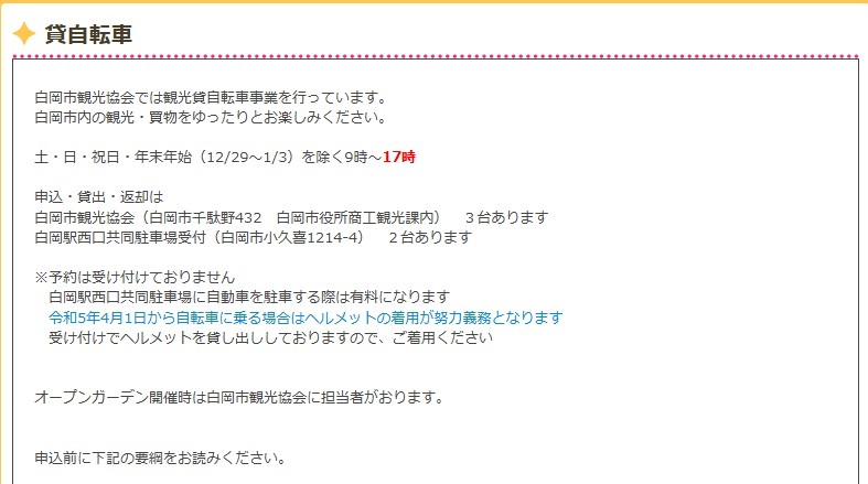 なお、貸出し自転車に関しては、観光協会HPをご覧ください。